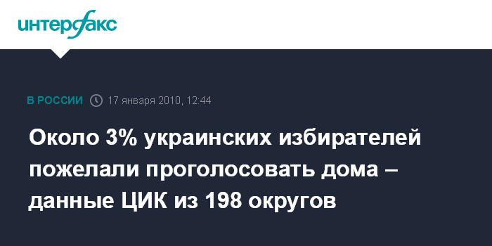 Киев. 17 января. INTERFAX.RU - По данным, поступившим из 198 украинских территориальных избирательных округов (всего создано 225 округов), заявления для голосования на дому подал 981 тыс.371 избиратель из 31 млн 808 тыс 814 человек, внесенных в списки для голосования, что составляет около 3% избирателей.