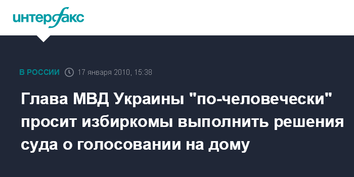 Киев. 17 января. INTERFAX.RU - Министр внутренних дел Украины Юрий Луценко предупреждает об уголовной ответственности за невыполнение судебных решений, в частности двух решений Киевского административного апелляционного суда - о голосовании на дому исключительно при наличии соответствующих медицинских документов и о невозможности внесения изменений в реестр избирателей в день голосования. Глава МВД на брифинге в воскресенье в Киеве продемонстрировал оба решения суда и обратился к руководителям и членам избирательных участков с просьбой выполнять решения суда.