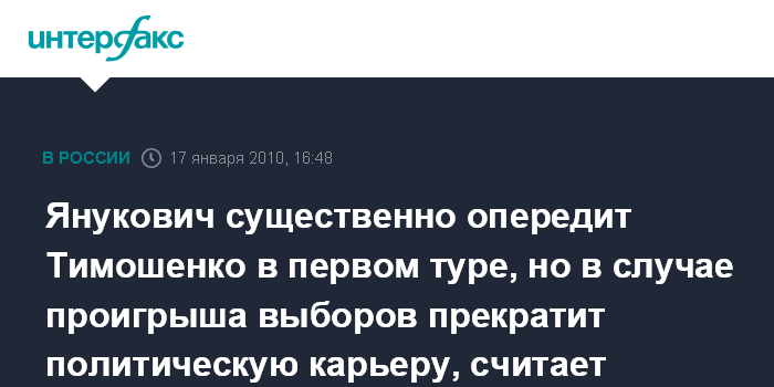 Он также отметил, что Ю.Тимошенко даже в случае своего поражения во втором туре будет оставаться политическим тяжеловесом на Украине в отличие от В.Януковича, который, в случае проигрыша, прекратит политическую карьеру.