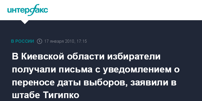 Киев. 17 января. INTERFAX.RU - Избиратели округа №91 (Киевская область) получили накануне выборов письма с уведомлением о переносе даты голосования, сообщает в воскресенье центральный штаб кандидата на пост главы Украины Сергея Тигипко.