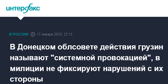 Донецк. 17 января. INTERFAX.RU - В Донецком областном совете называют действия граждан Грузии "системной провокацией". В МВД заверяют, что грузинские наблюдатели и внештатные корреспонденты не нарушают общественный порядок. Заявление о нарушениях со стороны грузинских граждан сделал председатель Донецкого областного совета Анатолий Близнюк на пресс-конференции в Донецке в воскресенье. "То, что творят грузины - это системная провокация, направленная против нашей страны. Они - просто беспредельщики, которые приехали со своей задачей", - сказал он. По его словам, в частности, задержан один из представителей грузинской делегации - у него в носке нашли элеткрошокер.