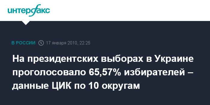 Киев. 17 января. INTERFAX.RU - На президентских выборах в Украине по состоянию на 20.00 в 10 округах проголосовало 65,57% избирателей.