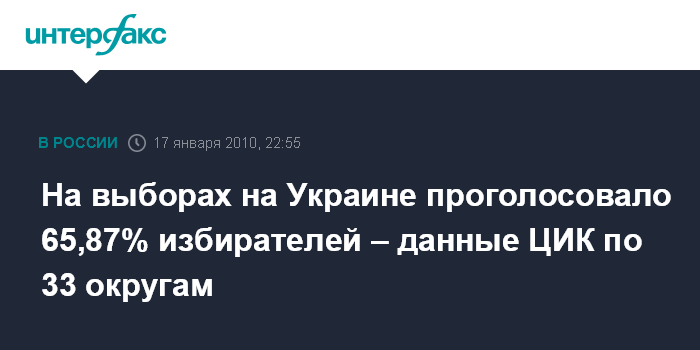 Киев. 17 января. ИНТЕРФАКС-УКРАИНА - На президентских выборах в Украине по состоянию на 20:00 в 33 округах проголосовало 65,87% избирателей.