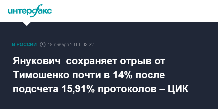 Янукович сохраняет отрыв от Тимошенко почти в 14% после подсчета 15,91% протоколов – ЦИК