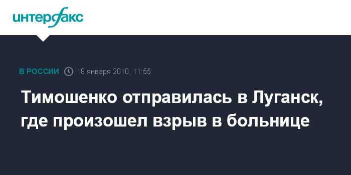 Москва. 18 января. INTERFAX.RU - Премьер-министр Украины Юлия Тимошенко вылетает в Луганск, где в результате нарушения прав безопасности в реанимационном отделении городской больницы N7 произошел взрыв кислорода, обвалились несколько этажей больницы.