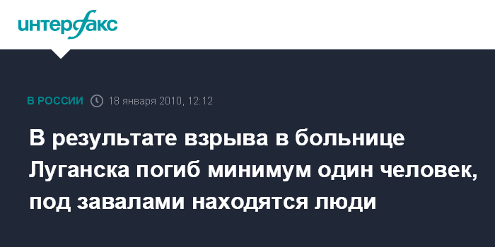 Москва. 18 января. INTERFAX.RU - Власти Луганска подтверждают гибель одного человека в результате взрыва в больнице, однако число жертв может возрасти, сообщает украинский "5 канал".