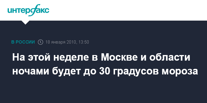 "В московском регионе и сопредельных областях, мы прогнозируем на ближайшей неделе преобладающую ночную температуру минус 20-25 градусов, местами до 30", - сказал в понедельник "Интерфаксу" Вильфанд.