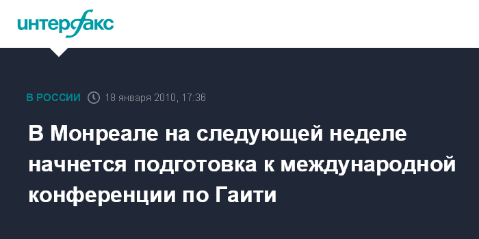 Москва. 18 января. INTERFAX.RU - Подготовка к международной конференции по восстановлению Гаити начнется 25 января в канадском Монреале, объявило в понедельник правительство Франции. "Первое подготовительное заседание будущей международной конференции по восстановлению и развитию Гаити состоится в следующий понедельник в Монреале. Важно, чтобы все были мобилизованы для того, жители Гаити продолжали получать помощь", - говорится в заявлении французского правительства.
