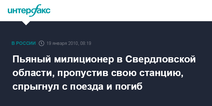 Пьяный милиционер в Свердловской области, пропустив свою станцию, спрыгнул с поезда и погиб