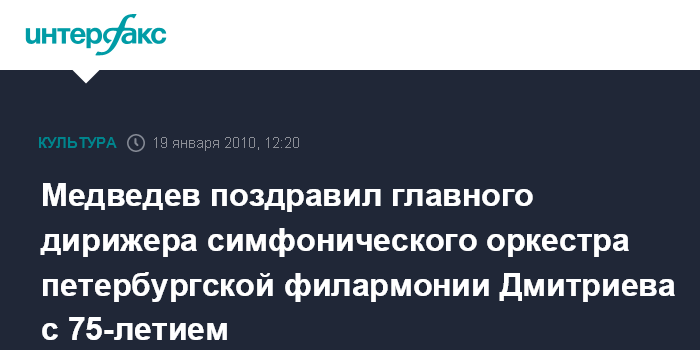 Москва. 19 января. INTERFAX.RU - Президент России Дмитрий Медведев поздравил главного дирижера и художественного руководителя Академического симфонического оркестра Санкт-Петербургской академической филармонии им.Д.Д.Шостаковича Александра Дмитриева с 75-летием, сообщает во вторник пресс-служба главы государства