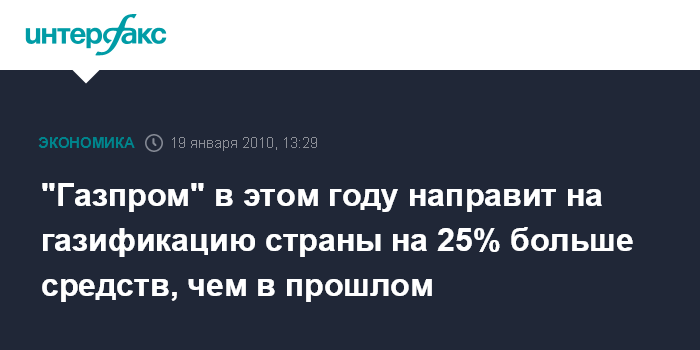 Москва. 19 января. INTERFAX.RU - "Газпром" в 2010 г. планирует на четверть увеличить ассигнования на выполнение программы газификации страны.