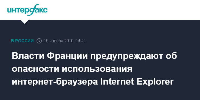 Москва. 19 января. INTERFAX.RU - Французская правительственная служба "СЕРТА", специализирующаяся на защите от пиратских атак во всемирной паутине, призвала пользователей сети Интернет отказаться от работы со всеми версиями вэб-браузера Internet Explorer, сообщила во вторник британская телерадиокорпорация BBC. Тем самым, власти Франции последовали примеру германской Федеральной службы безопасности в сфере информации, посоветовавшей пользователям отказаться от этого интернет-браузера.