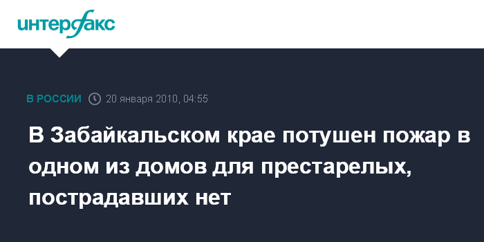 Чита. 20 января. ИНТЕРФАКС-СИБИРЬ - В доме-интернате для престарелых и инвалидов поселка Хапчеранга Забайкальского края утром 20 января в результате возгорания было эвакуировано 55 человек, пострадавших нет.