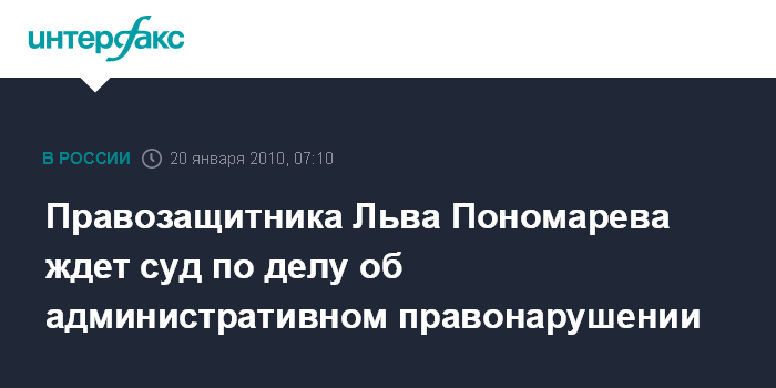 Москва. 20 января. ИНТЕРФАКС - Ветерана российского правозащитного сообщества, лидера движения "За права человека" Льва Пономарева ждет суд по делу об административном правонарушении за организацию пикета в столице, на Чистопрудном бульваре в память адвоката Станислава Маркелова и журналистки Анастасии Бабуровой.