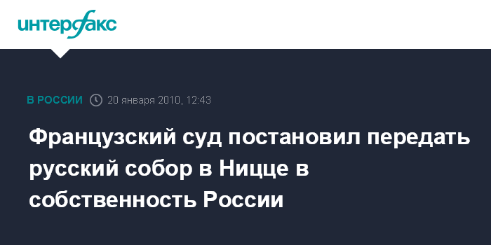 Москва. 20 января. INTERFAX.RU - Суд Ниццы признал Российское государство единственным законным владельцем русского православного собора Святого Николая в этом городе, имущества храма и прилегающей к нему земли. Такое решение было принято в среду на заседании суда, сообщил корреспонденту портала "Интерфакс-Религия" (www.interfax-religion.ru) представитель православной общины Парижа. По его словам, решение суда "подлежит немедленному исполнению".