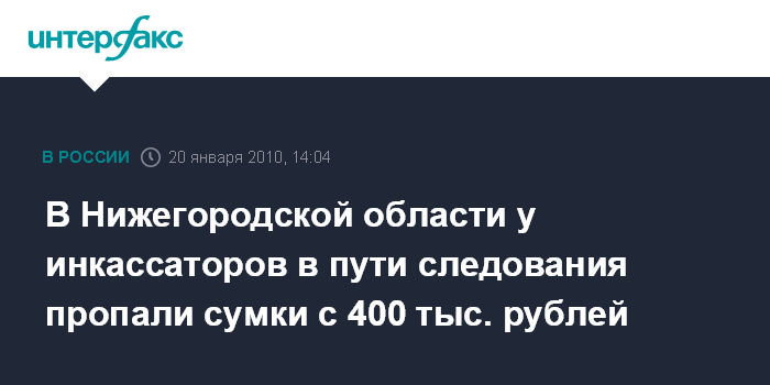 Москва. 20 января. INTERFAX.RU – Сотрудники милиции в городе Арзамасе Нижегородской области расследуют обстоятельства пропажи при перевозке трех инкассаторских сумок с деньгами.