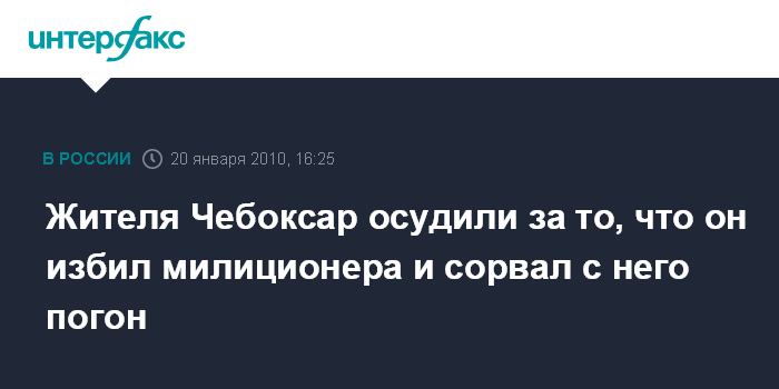 Москва. 20 января. INTERFAX.RU - Калининский районный суд Чебоксар приговорил местного жителя к 2 годам лишения свободы с отбыванием наказания в исправительной колонии строгого режима за то, что тот ударил милиционера и сорвал с него погон.
