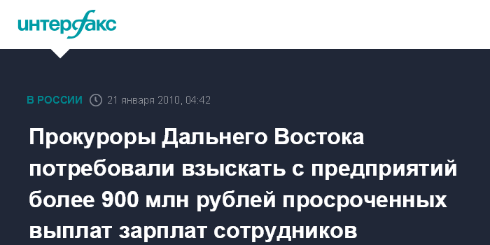 Хабаровск. 21 января. ИНТЕРФАКС - ДАЛЬНИЙ ВОСТОК - На Дальнем Востоке в результате действий прокуратуры суды предписали взыскать с предприятий более 900 млн рублей долгов по зарплате, что позволило существенно снизить напряженность на рынке труда.