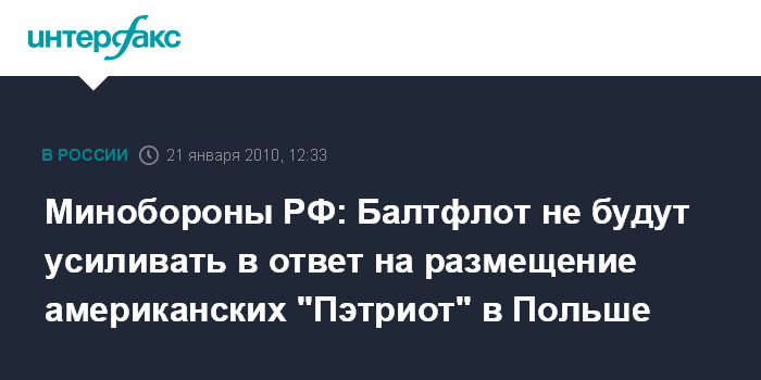 Москва. 21 января. INTERFAX.RU - Не планируется никаких изменений боевого и численного состава Балтийского флота в связи с размещением в Польше американских ракет "Пэтриот", заявили "Интерфаксу-АВН" в четверг в управлении пресс-службы и информации Минобороны РФ. "Информация, опубликованная в ряде СМИ о якобы усилении надводной, подводной авиационной составляющей Балтийского флота в связи с размещением в Польше американских ракетных комплексов "Пэтриот" вблизи с границей с Россией, не соответствует действительности", - заявили в управлении.