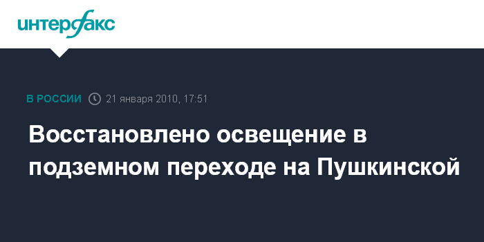 Москва. 21 января. INTERFAX.RU - Полностью восстановлено освещение в подземном переходе на Пушкинской площади в центре Москвы, которое прекратилось в четверг днем в большей его части после замыкания в электрощитовой.