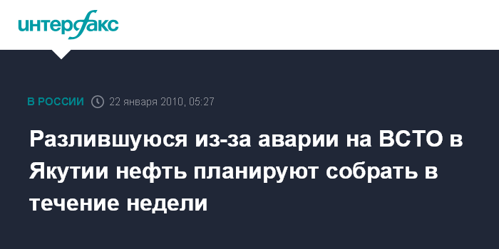 Хабаровск/Якутск. 22 января. ИНТЕРФАКС-ДАЛЬНИЙ ВОСТОК - На месте розлива нефти у якутского города Ленска, где проходит нефтепровод "Восточная Сибирь - Тихий океан" (ВСТО), собрано около 35 кубометров нефтепродуктов. Все работы планируется завершить к 28 января.