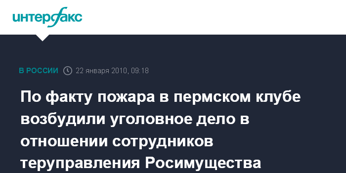 Москва. 22 января. INTERFAX.RU - В связи с пожаром в клубе "Хромая лошадь" в Перми возбуждено еще одно уголовное дело, о халатности, - в отношении сотрудников территориального управления Росимущества, сообщили "Интерфаксу" в пятницу в СКП РФ.