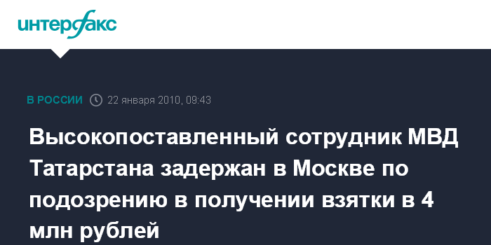 Москва. 22 января. INTERFAX.RU – В Москве задержан замначальника Службы тыла МВД Татарстана по подозрению в получении взятки в 4 млн рублей, сообщил "Интерфаксу" в четверг глава Следственного управления СКП РФ по Москве Анатолий Багмет.