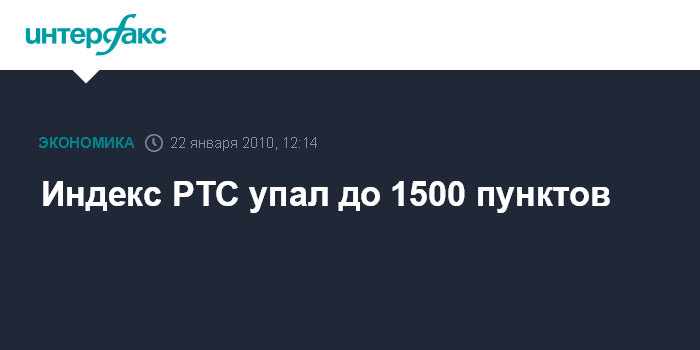 Москва. 22 января. INTERFAX.RU – Индекс РТС, один из основных российских фондовых индикаторов, днем в пятницу скатился до психологического уровня 1500 пунктов, который был преодолен на первых в 2010 году торгах.
