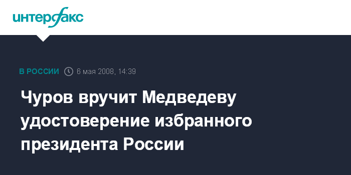 Москва. 6 мая. INTERFAX.RU - Удостоверение избранного президента России будет вручено Дмитрию Медведеву в ходе его рабочей встречи с председателем Центризбиркома России Владимиром Чуровым.