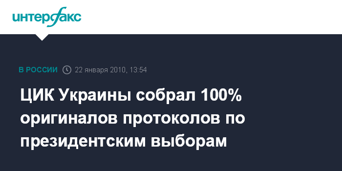 Москва. 22 января. INTERFAX.RU - В Центральную избирательную комиссию Украины поступили 100% оригиналов протоколов окружных избирательных комиссий с так называемыми мокрыми печатями по выборам президента Украины 17 января, сообщили агентству "Интерфакс-Украина" в пресс-службе комиссии в пятницу. В то же время в ЦИК продолжают принимать уточненные протоколы. Однако в пресс-службе не смогли назвать общее количество таких протоколов окружных комиссий, которые должны быть уточнены. По состоянию на 12:00 ЦИК принял уже 9 уточненных протоколов.