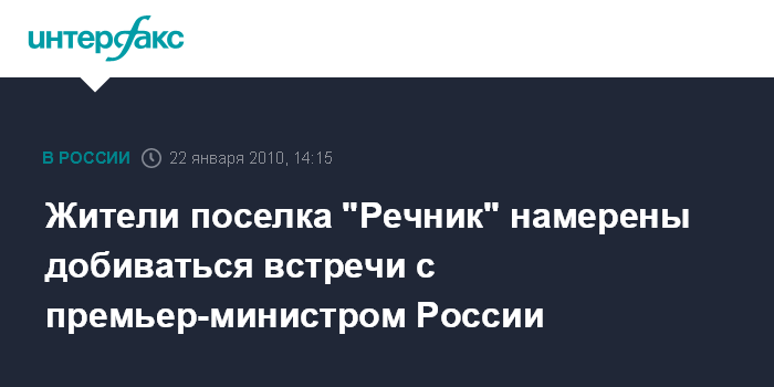 Москва. 22 января. INTERFAX.RU - Группа жителей поселка "Речник" намерена отправиться в приемную правительства РФ для встречи с премьер-министром Владимиром Путиным, передает корреспондент "Интерфакса".
