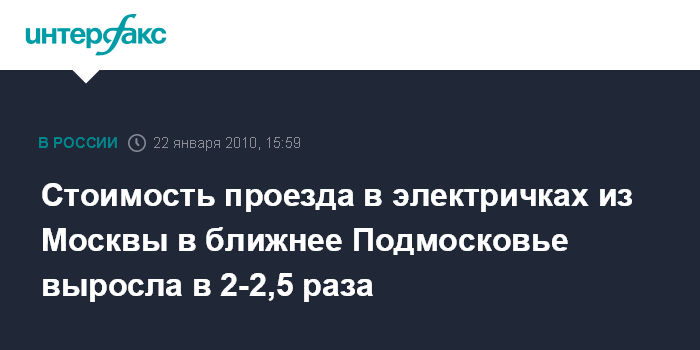 Москва. 22 января. INTERFAX.RU - Стоимость проезда в электричках из Москвы в ближнее Подмосковье выросла более чем в 2 раза, сообщают корреспонденты "Интерфакса". Так, цена билета от станции Выхино до станций Люберцы-1, Панки и Томилино с четверга повысилась с 16,5 до 42,5 рубля.