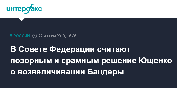 В Совете Федерации считают позорным и срамным решение Ющенко о возвеличивании Бандеры