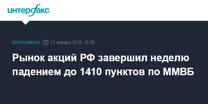 Москва. 22 января. INTERFAX.RU - Рынок акций РФ завершил неделю падением до 1410 пунктов по индексу ММВБ на внешнем негативе, растеряв почти весть прирост с начала года из-за новостей из США, где намечается введение ограничительных мер для банков.