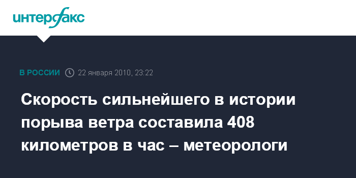 Женева. 22 января. ИНТЕРФАКС - Специалисты Всемирной метеорологической организации сообщили в пятницу, что установили скорость сильнейшего в истории порыва ветра - 408 километров в час.