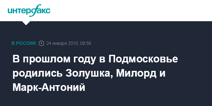 Москва. 24 января. INTERFAX.RU - Список необычных имен жителей Подмосковья в 2009 году пополнился еще пятью, сообщили "Интерфаксу" в главном управлении ЗАГСа по Московской области. Там отметил, что на протяжении нескольких лет лидерами среди имен, которыми называют новорожденных в Московской области, остаются Дарья, Анна, Максим и Александр. "Вместе с тем некоторые жители Подмосковья дают своим детям уникальные имена. Так, в 2009 году список пополнился пятью необычными именами: у нас родились Женевьева, Золушка, Весна, а также Марк-Антоний и Милорд", - сказал собеседник агентства.