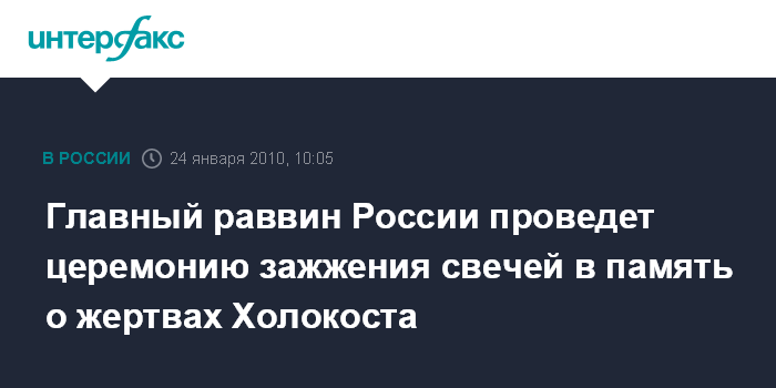 Москва. 24 января. INTERFAX.RU - В Московском еврейском общинном центре 27 января состоится церемония зажжения свечей, посвященная памяти жертв Холокоста. В церемонии примут участие главный раввин России Берл Лазар, президент Федерации еврейских общин России (ФЕОР) Александр Борода, представители зарубежных посольств и международных организаций, действующих в стране, сообщили корреспонденту "Интерфакс-Религия" (www.interfax-religion.ru) в пресс-службе ФЕОР. "Ежегодное поминовение жертв Холокоста призвано сохранить историческую память об уничтожении миллионов человеческих жизней в годы второй мировой войны и осудить нацизм во всех его проявлениях, чтобы никогда более не допустить повторения трагедии геноцида", - подчеркнул собеседник агентства.