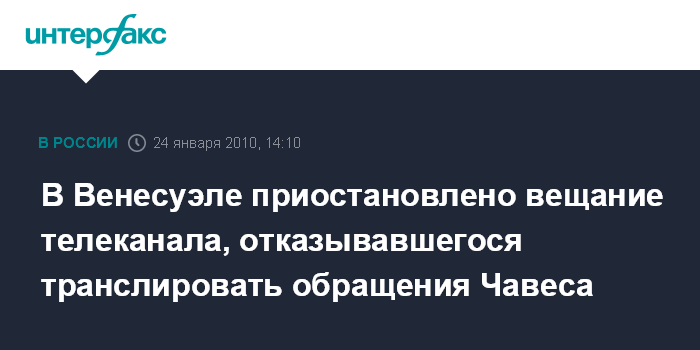 Лондон. 24 января. INTERFAX.RU - Венесуэльские провайдеры кабельного телевидения прекратили вещание оппозиционного телеканала RCTV, в программах которого звучала критика в адрес президента страны Уго Чавеса. Как сообщает в воскресенье британская телерадиовещательная корпорация Би-би-си, трансляция RCTV была остановлена по распоряжению правительства страны за несоблюдение правила, согласно которому все венесуэльские телеканалы обязаны показывать обращения президента в прямом эфире.