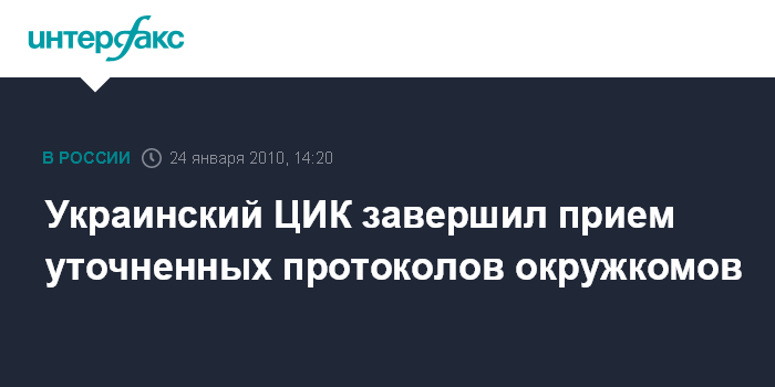 Киев. 24 января. INTERFAX.RU - Центральная избирательная комиссия Украины в воскресенье завершила прием протоколов окружных избирательных комиссий об итогах голосования в территориальных избирательных округах с пометкой "уточненный". Как сообщил в воскресенье агентству "Интерфакс-Украина" член комиссии Михаил Охендовский, данные всех протоколов были оглашены и рассмотрены на заседании комиссии, которое длилось с понедельника, 18 января, по воскресенье (24 января). Последний уточненный протокол, составленный 23 января, был подан в ЦИК окружной избирательной комиссией территориального избирательного округа #110 (г. Лисичанск, Луганская область) в 11.35. Таким образом, в установленном законом порядке были проведены все процедуры, необходимые для установления результатов выборов президента Украины 17 января 2010 года.