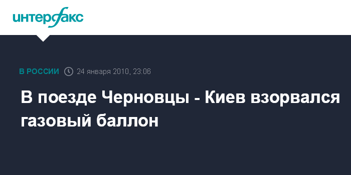 Киев. 24 января. ИНТЕРФАКС-УКРАИНА - На Украине на станции Лужаны в третьем вагоне пассажирского поезда Черновцы - Киев в купе проводников взорвался газовый баллон.