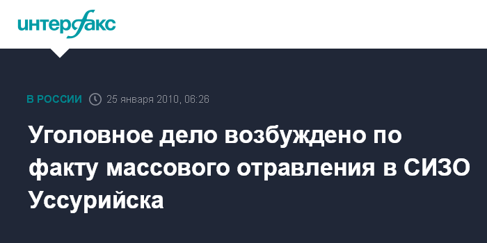 Владивосток. 25 января. ИНТЕРФАКС-ДАЛЬНИЙ ВОСТОК - Следственные органы Приморья возбудили уголовно дело по факту массового отравления заключенных Уссурийского следственного изолятора, в результате которого трое из шести отравившихся скончались в больнице.