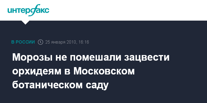 Москва. 25 января. INTERFAX.RU - Несмотря на длительные морозы, в оранжереях Главного московского ботанического сада цветут орхидеи, сообщили "Интерфаксу" в администрации сада в понедельник. "Скоро у нас распустятся камелии и азалии", - отметил собеседник агентства. По его словам, теплолюбивым растениям созданы все условия для выживания в морозы, однако без инцидентов этой зимой не обошлось. "Мы потеряли более 100 видов тропических растений после отключения подачи тепла в оранжереях, которое произошло 14 декабря", - посетовал собеседник "Интерфакса", отметив, что погибли пальмы, которые не выдерживают температуры ниже 18 градусов тепла.