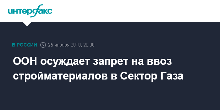 Женева. 25 января. INTERFAX.RU - В Израиле продолжает действовать жесткий запрет на ввоз материалов, необходимых для восстановления Cектора Газа, пострадавшего в результате израильской операции "Расплавленный свинец" в 2008 г., констатировал в понедельник глава Ближневосточного агентства ООН для помощи палестинским беженцам (БАПОР) Джон Гинг.