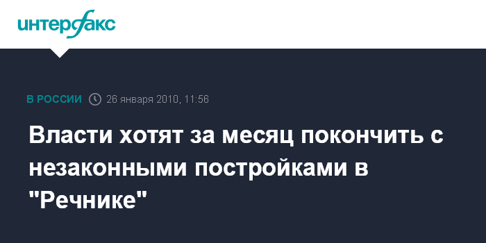 Москва. 26 января. INTERFAX.RU – Власти московской управы "Крылатское" намерены в течение месяца решить вопрос о сносе незаконных строений в поселке "Речник".