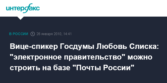 Москва. 26 января. INTERFAX.RU - По мнению вице-спикеры Госдумы Любови Слиски, в условиях, когда почти половина населения страны не пользуются компьютером и не имеют доступа к интернету, структурой, которая смогла бы обеспечить гражданам страны доступ к порталу государственных услуг, является "Почта России". "Она имеет развитую сеть отделений по всей стране, ее услугами пользуется почти каждый россиянин, к ней просто привыкли люди. Почте просто нужно помочь в модернизации своих подразделений, особенно в регионах", - считает вице-спикер.