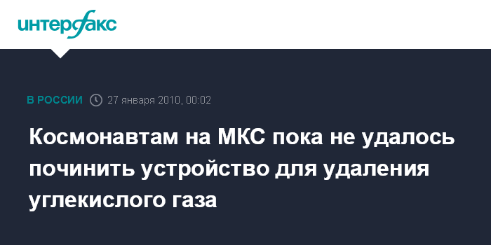 Установка "Воздух", предназначенная для удаления из атмосферы станции углекислого газа, начала "барахлить" еще 22 января. В тот день она дважды выключалась. История повторилась 24 и 25 января: через некоторое время после активации установка "Воздух" автоматически отключалась.