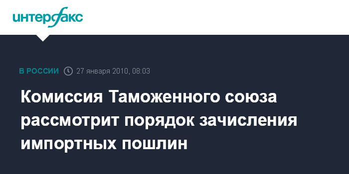 Москва. 27 января. ИНТЕРФАКС - Комиссия Таможенного союза России, Белоруссии и Казахстана на заседании в среду планирует рассмотреть проект соглашения о зачислении и распределении импортных таможенных пошлин.