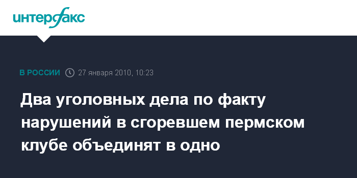 Москва. 27 января. INTERFAX.RU – Следственное управление СКП РФ по Пермскому краю намерено объединить в одно производства два уголовных дела, касающихся нарушений, выявленных в пермском клубе "Хромая лошадь".