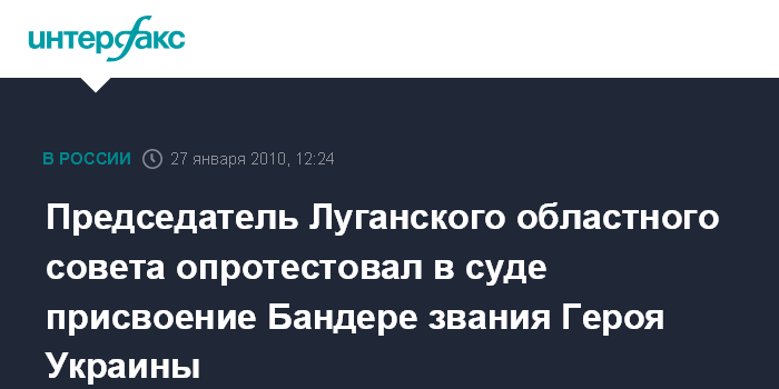Москва. 27 января. INTERFAX.RU – Председатель Луганского областного совета Валерий Голенко обратился в Луганский окружной административный суд с требованием признать противоправным и отменить указ президента Украины Виктора Ющенко о присвоении звания Героя Украины лидеру Организации украинских националистов (ОУН) Степану Бандере.