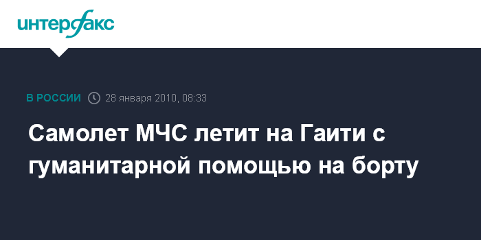 Москва. 28 января. INTERFAX.RU - В 6:15 мск в четверг с аэродрома Раменское вылетел самолет ИЛ-76 МЧС РФ с 15 тоннами гуманитарной помощи для пострадавшего от землетрясения населения Гаити, сообщили в управлении информации МЧС РФ.